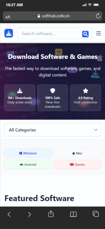 A software download platform with categories and secure access, plus a full admin dashboard.